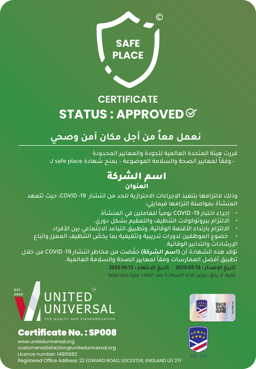 The COVID-19 crisis has created far-reaching consequences that go beyond the disease itself, to eliminate the effects of the crisis on the economy as a whole, and the accompanying paralysis in the business sector and the suspension of the work of many facilities and companies. The start of the global trend towards commitment to preventive and precautionary measures that limit the spread of COVID-19 and reduce its risks.Based on this, the united universal International Authority announces the launch of the SAFE PLACE certification program aimed at supporting efforts to limit the spread of COVID-19 and epidemic diseases and helping restaurants, hotels and service facilities to adhere to preventive measures and apply precautionary measures to create safe environments that rebuild customer confidence in accordance with standards Global health and safety.