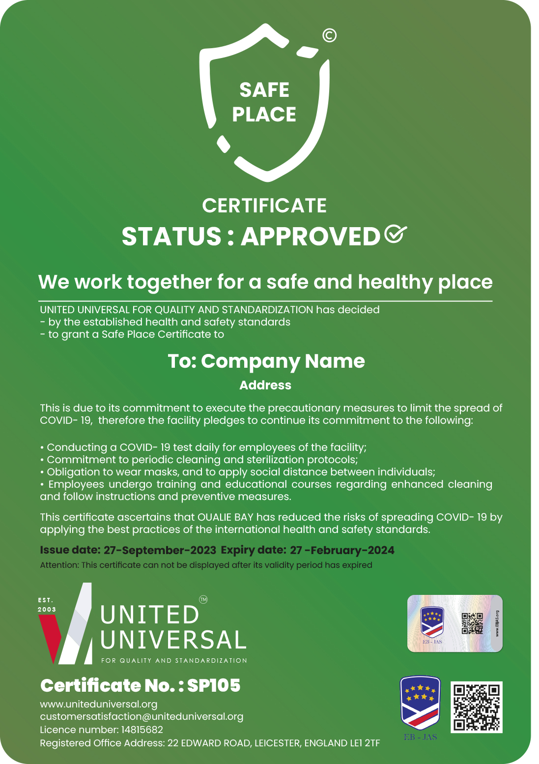 An international certificate issued and certified by the united universal Authority, aimed at ensuring the comfort and confidence of individuals in the facilities, and it is a culmination of the facility for its efforts in limiting the spread of COVID-19 and epidemic diseases and its continuous compliance with the application of best practices and preventive measures to ensure the health and safety of all customers and workers within the facility